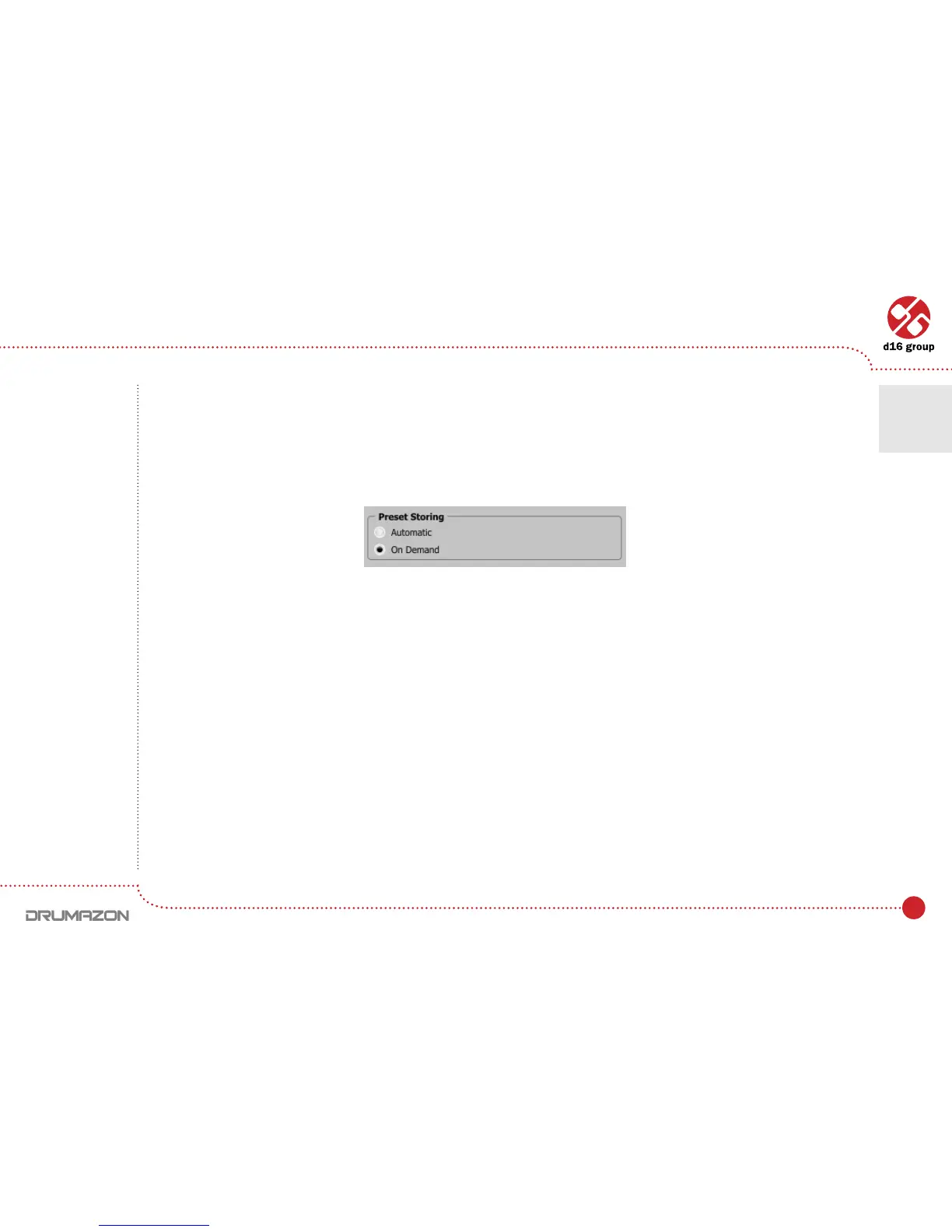 The Preset StoringagissavedintheDrumazoncongurationleandappliestoallnewinstancesoftheplug-in.