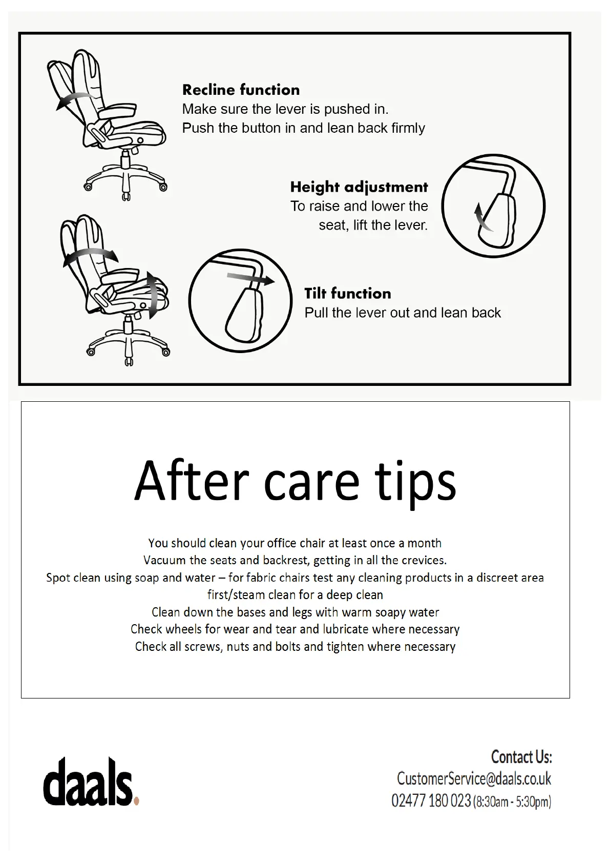 daals MO17 - Recline Function; Height Adjustment; Tilt Function; After Care Tips