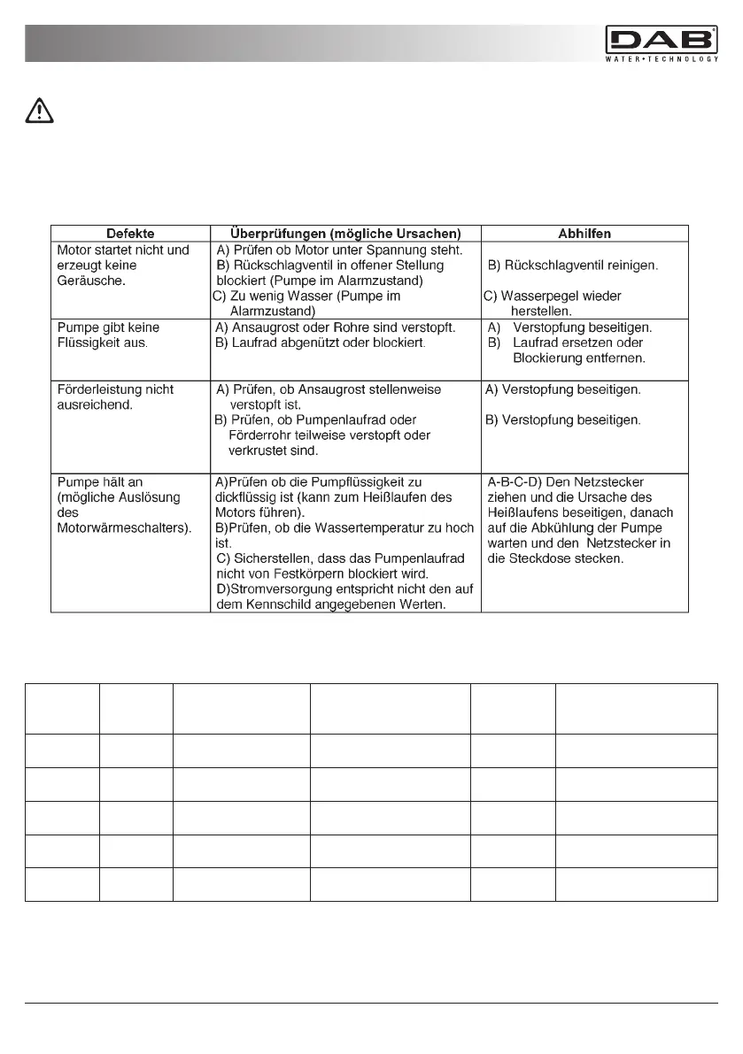 Vor der Fehlersuche muss die Pumpe vom Stromnetz getrennt werden (Netzstecker ziehen).