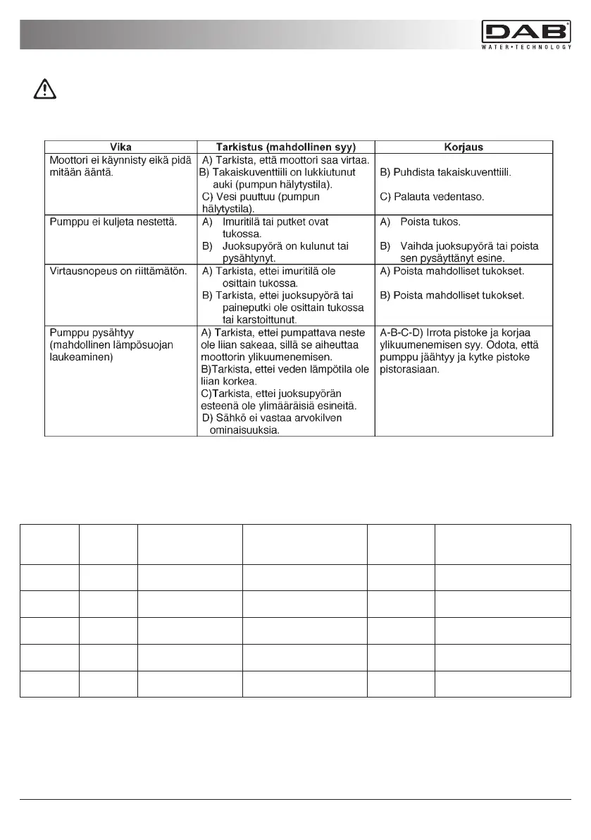 Katkaise pumpun sähkö ennen vianetsintää (irrota pistoke pistorasiasta). Jos sähköjohto tai