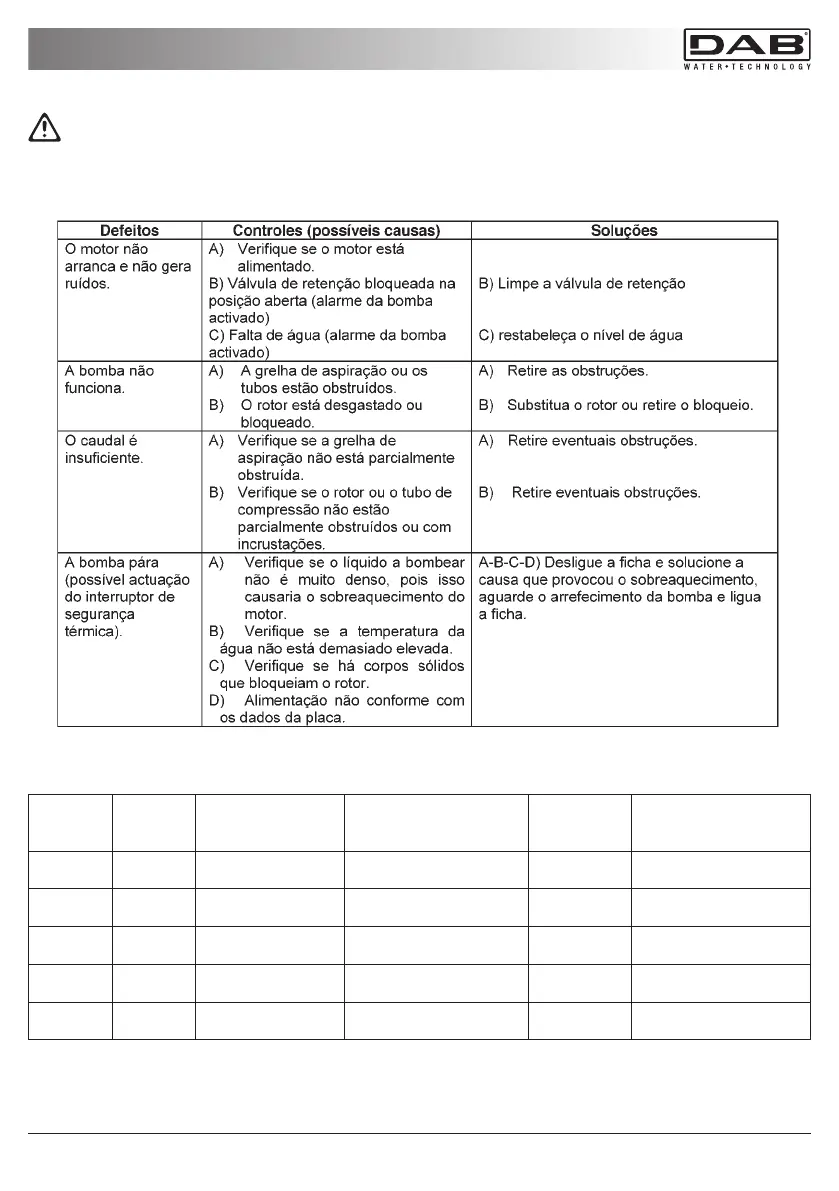 Antes de iniciar a localização dos defeitos, é necessário desligar a ligação eléctrica da bomba (desligar