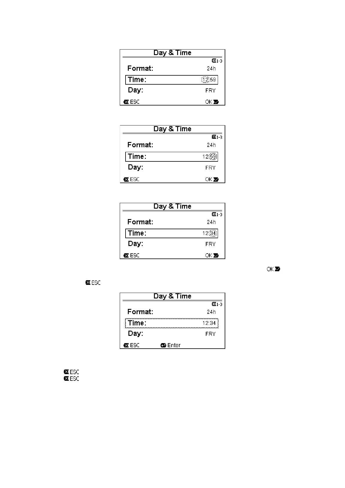 6. When the new value is completed (12:34 in the example), we confirm by pressing “OK” [ ], and leave the