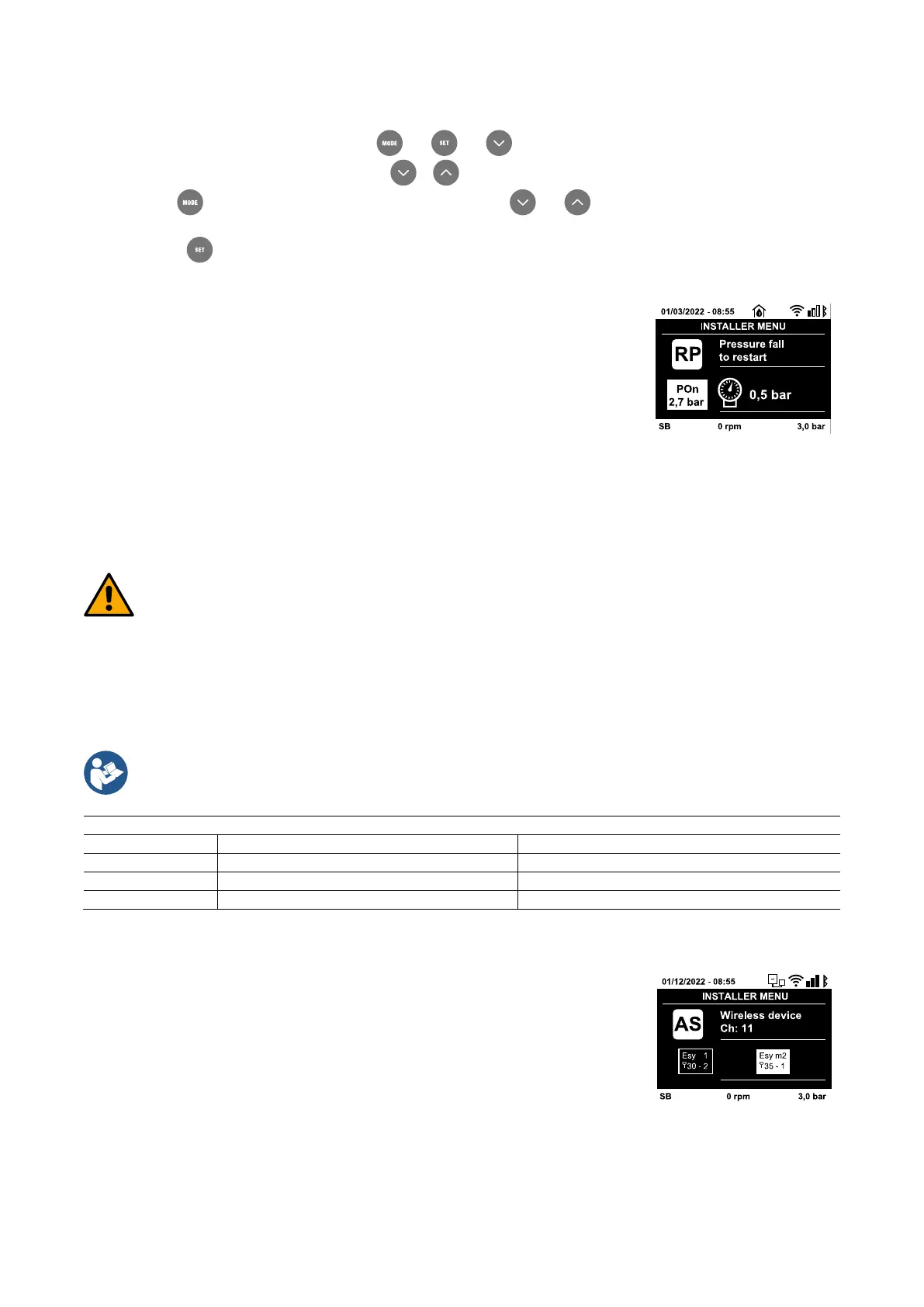 For example if the setpoint pressure is 3,0 bar and RP is 0,3 bar the pump will restart at 2,5 bar.