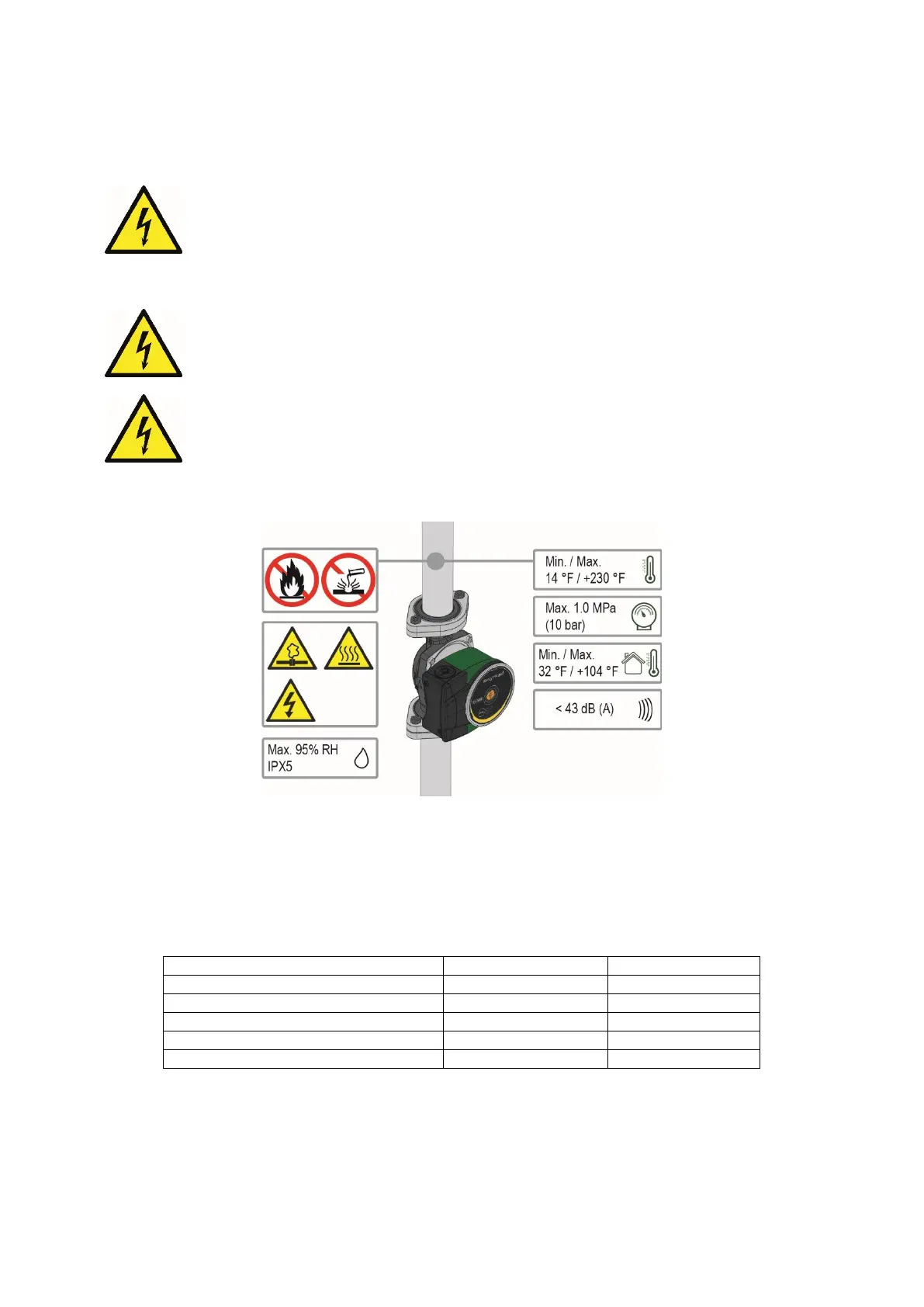 Figure 1: Pumped liquids, warnings and operating conditions