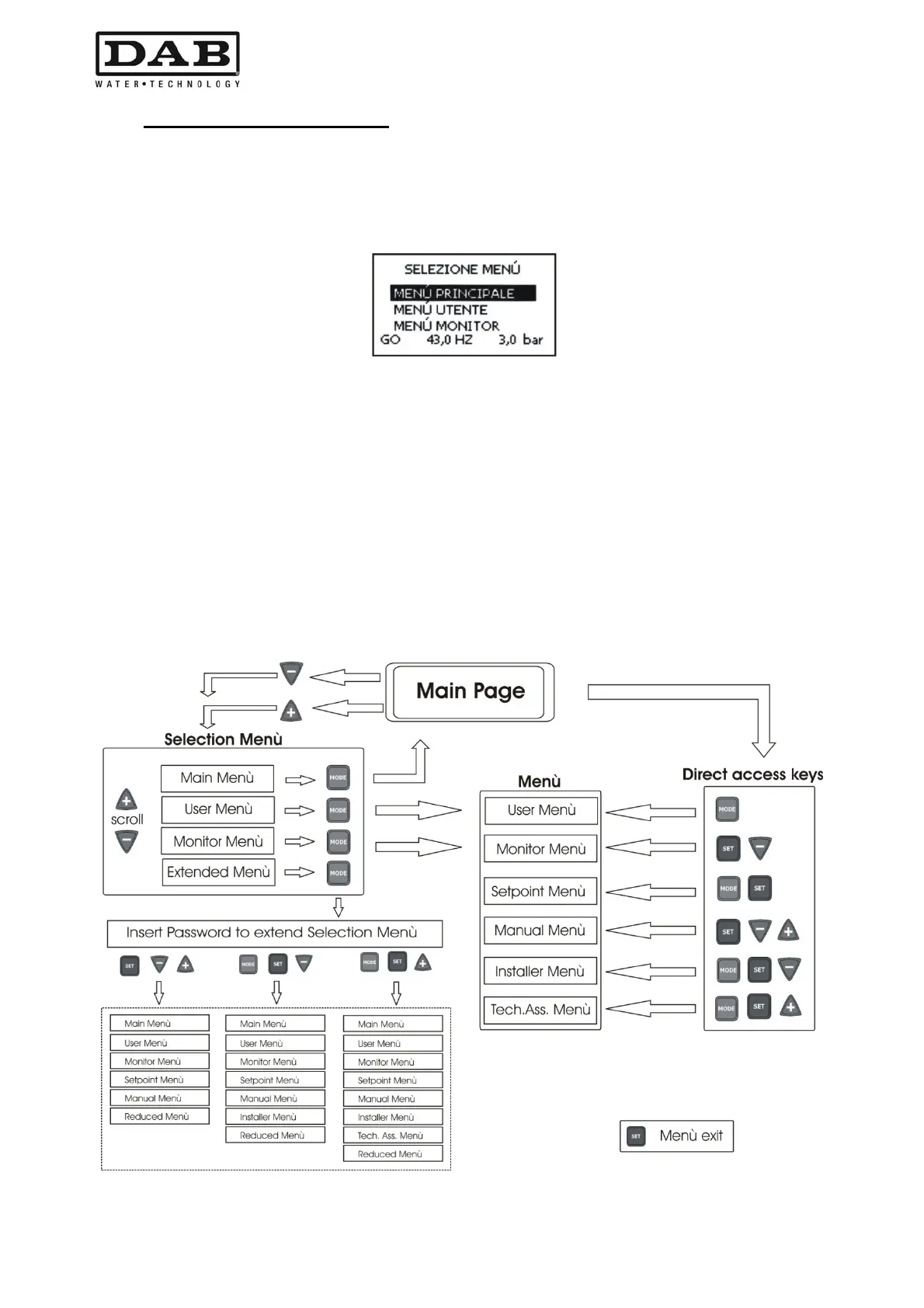 Τα μενού που εμφανίζονται είναι τα MAIN, UTENTE, MONITOR, και στη συνέχεια εμφανίζεται ένα τέταρτο