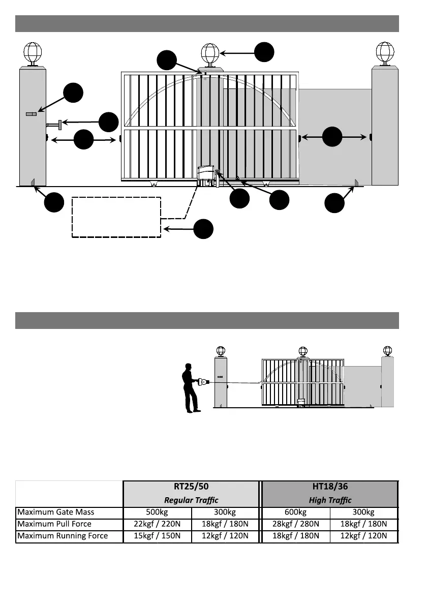 Pull Force: place the gate in the fully open/closed posion and pull on the scale unl the gate starts moving. The
