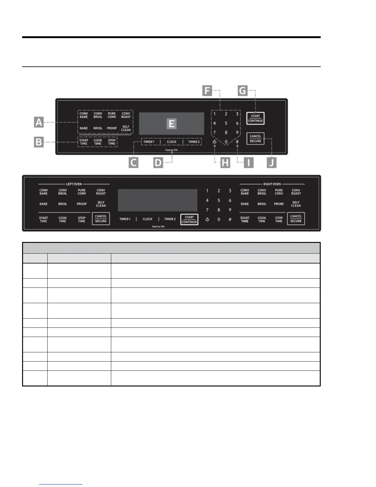 E Display Shows time of day and oven operations (e.g., cook temperature, remaining cook time).