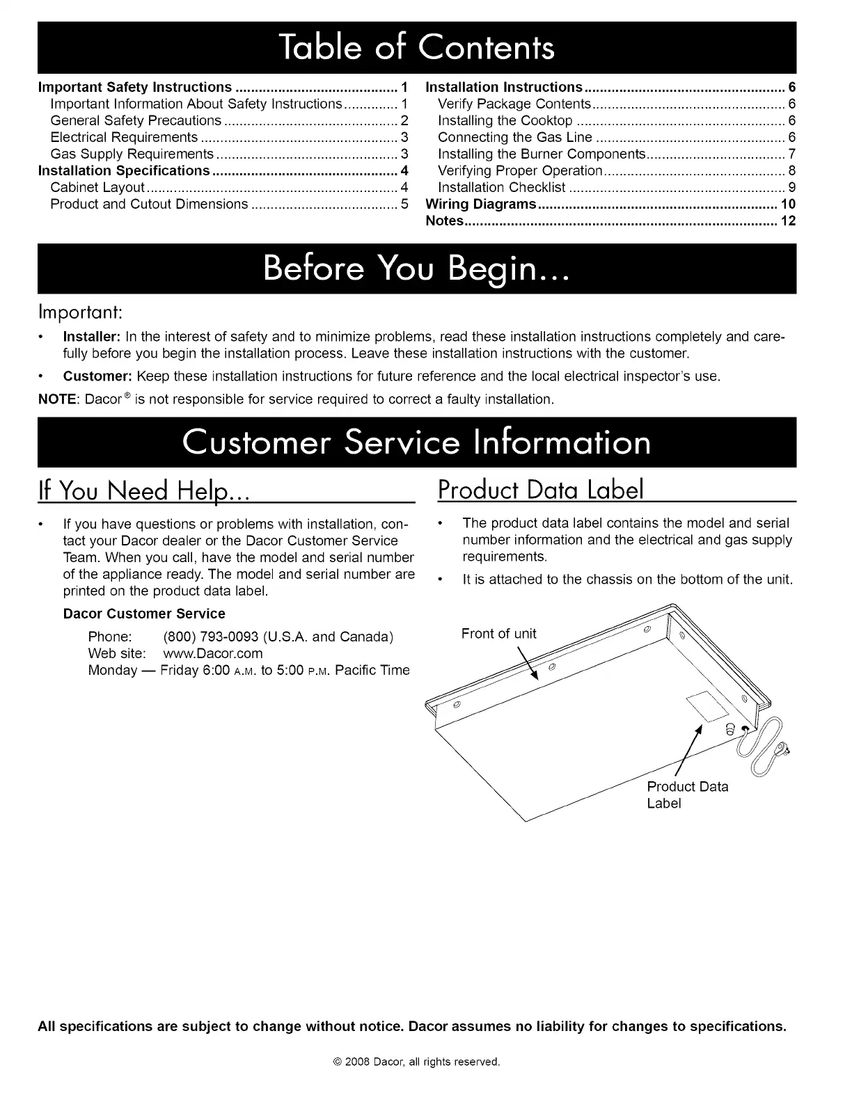 NOTE: Dacor ®is not responsible for service required to correct a faulty installation.