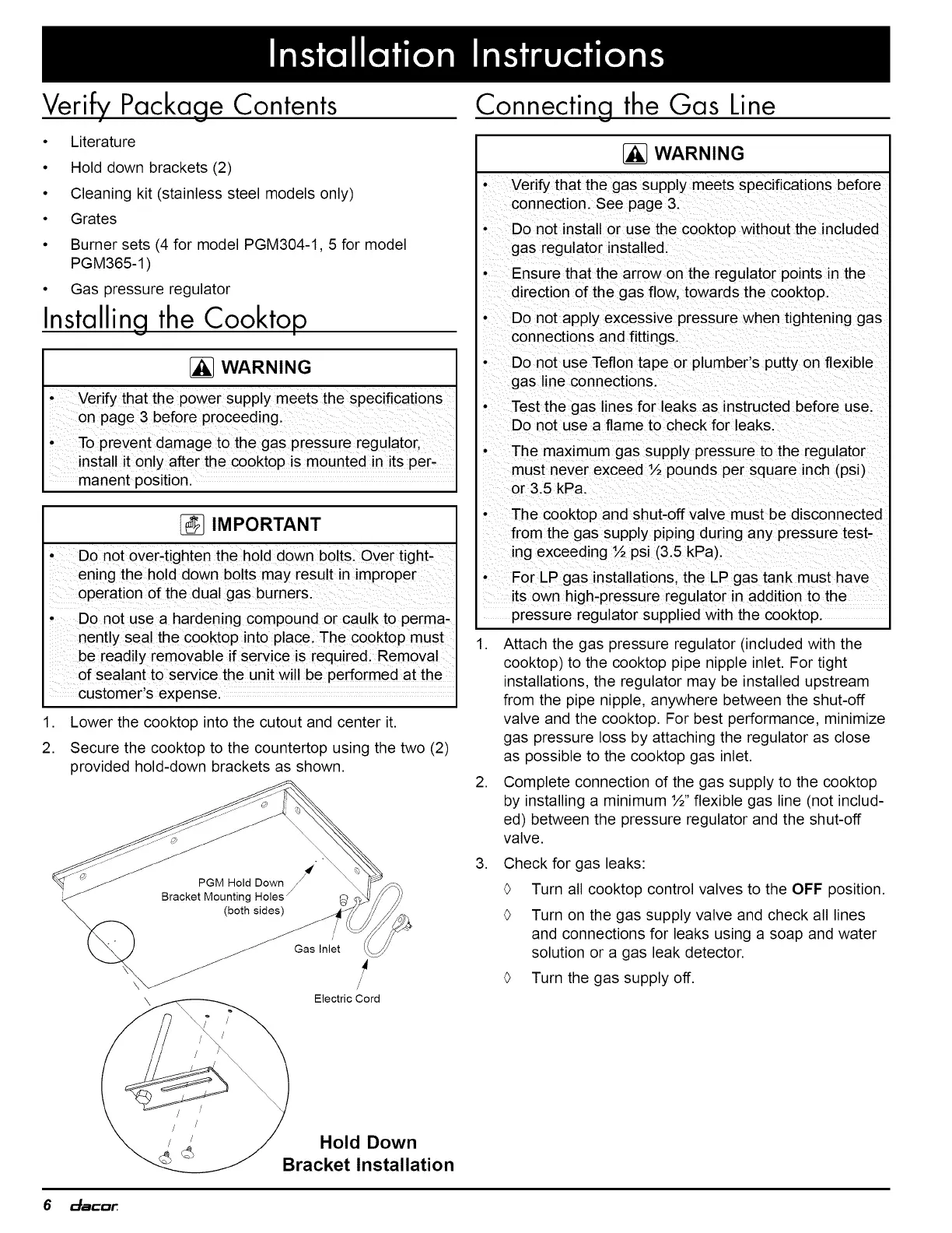 • Do not install or use the cooktop without the included