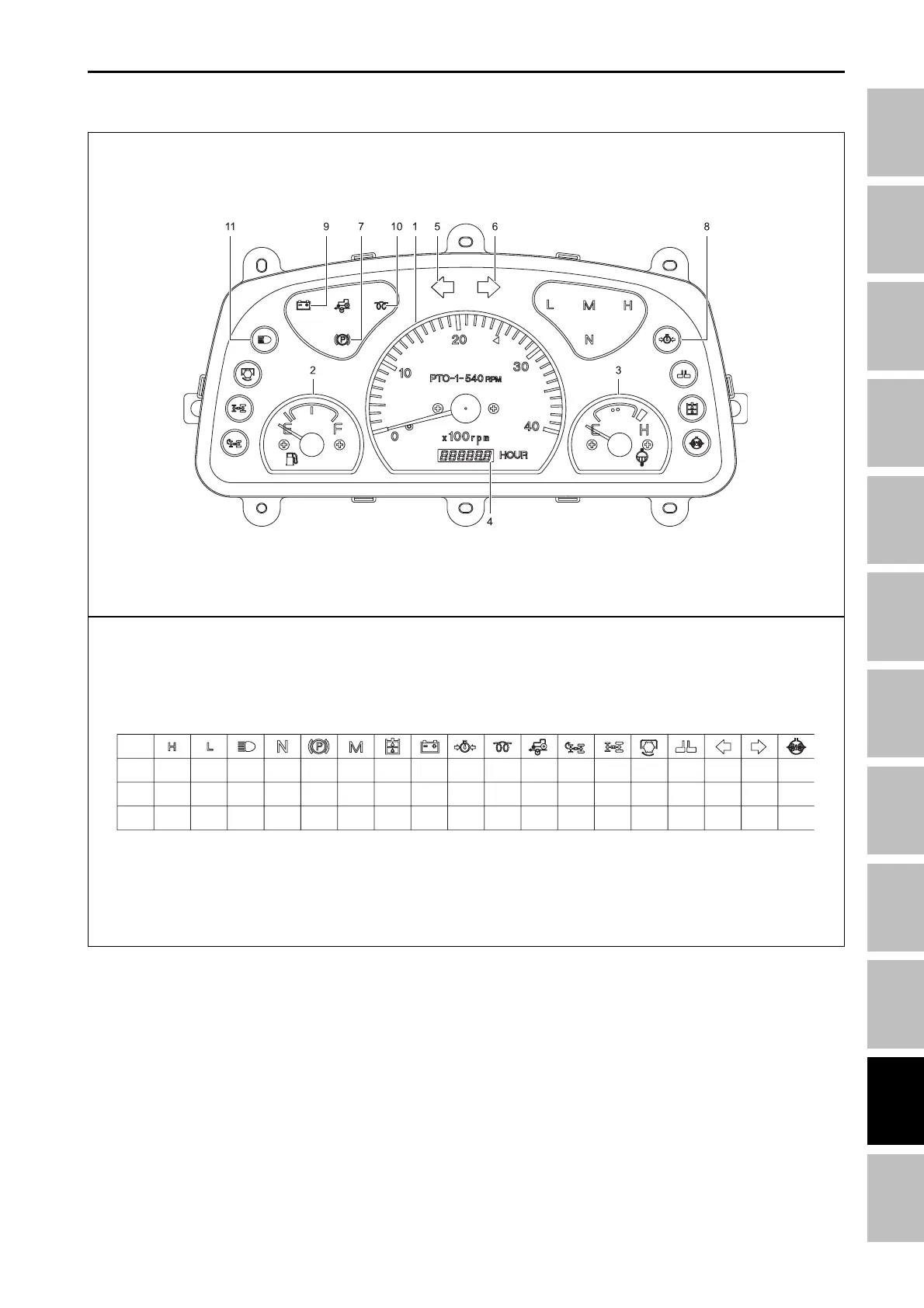 This shows entire condition of the tractor. It consists of 3 gauges, hour meter and 7 warning lamps.