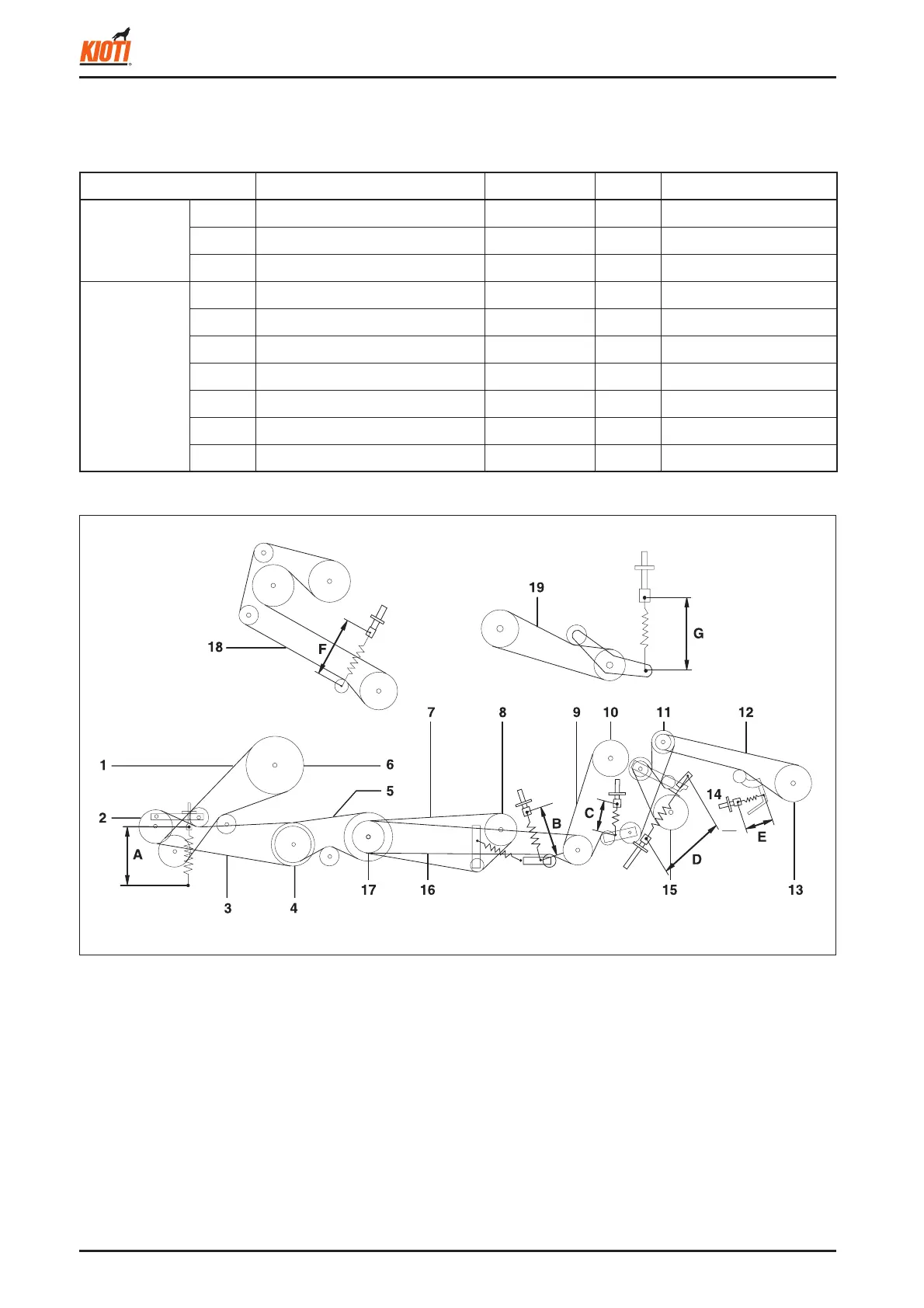 Adjust each belt’s tension with an adjusting bolt or cable bolt to maintain the proper return spring length as shown in the