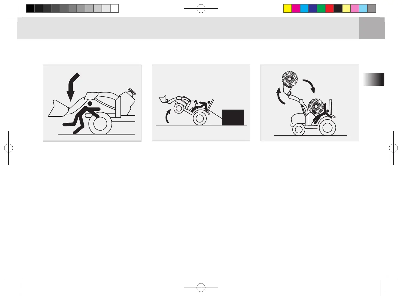 2. Do not stand under the lifted loader