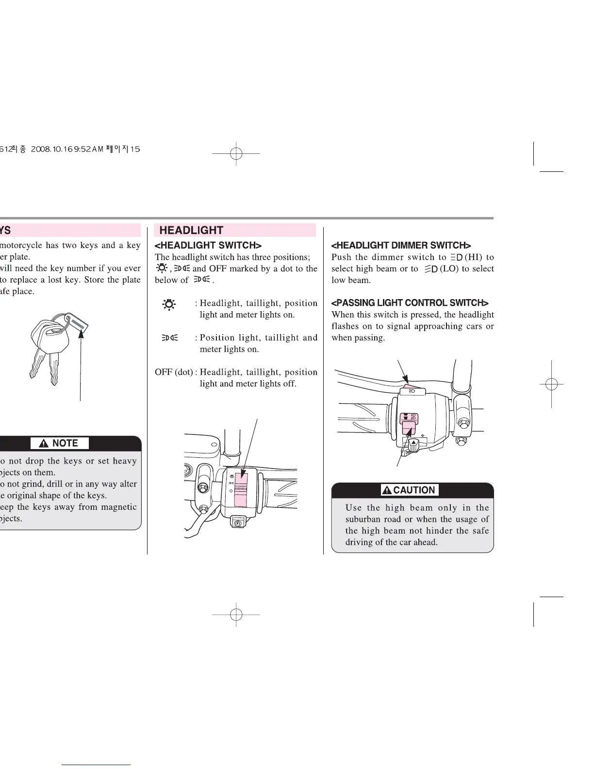 DAELIM ROADWIN FI - CATALOG - Equipment Usage; Steering Lock Operation; Seat Removal and Installation