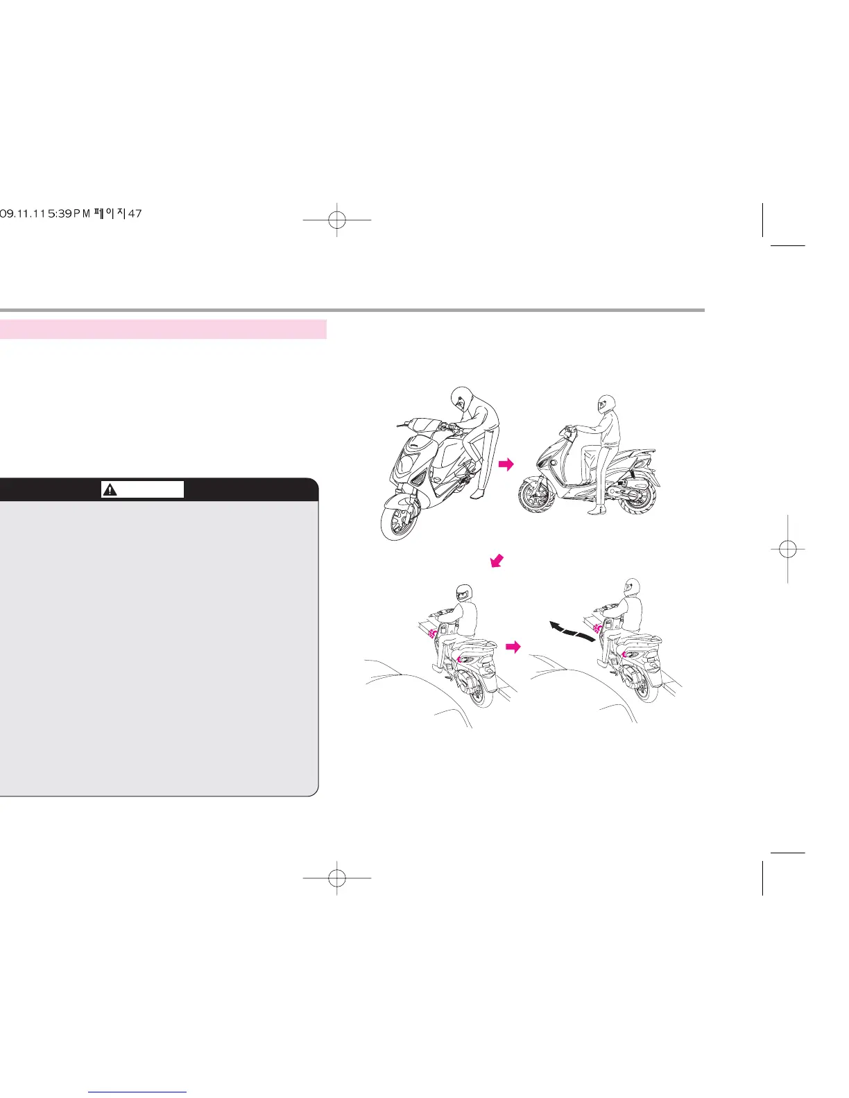 ① Get on the vehicle after pulling back the stand.