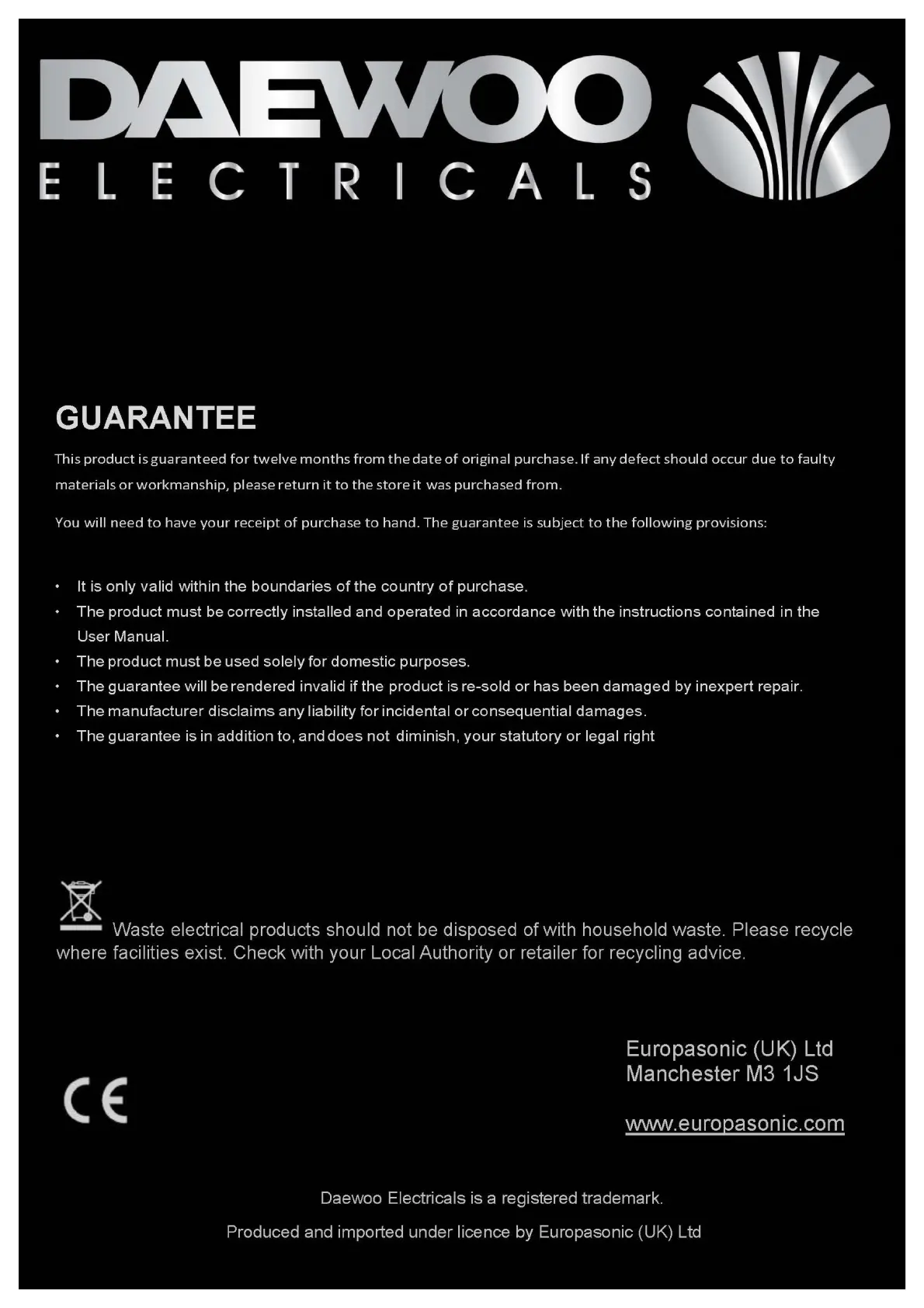 Daewoo electricals SDA1194 - Guarantee Information