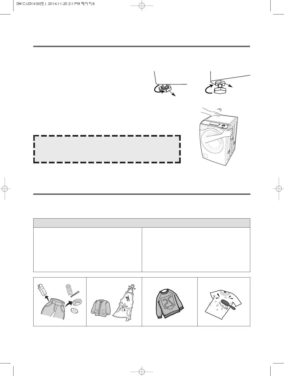 2 Adjust the level of washer using adjustable legs.