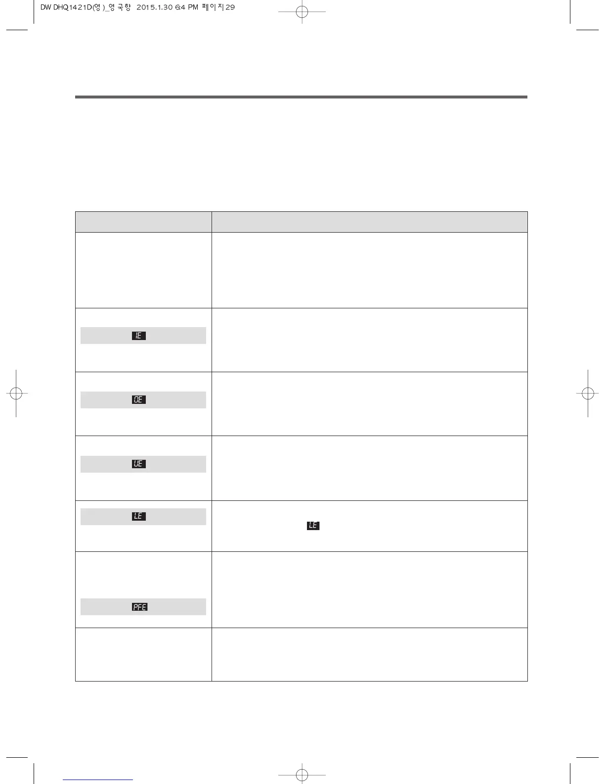 If an error code such as IE, OE, UE is displayed on the control panel, first try turning off the power