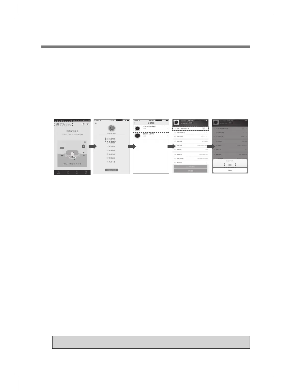 ① 계정버튼 클릭 ② 设备管理 ③ 해제할 기기 선택 ④ 解除绑定 ⑤ 删除