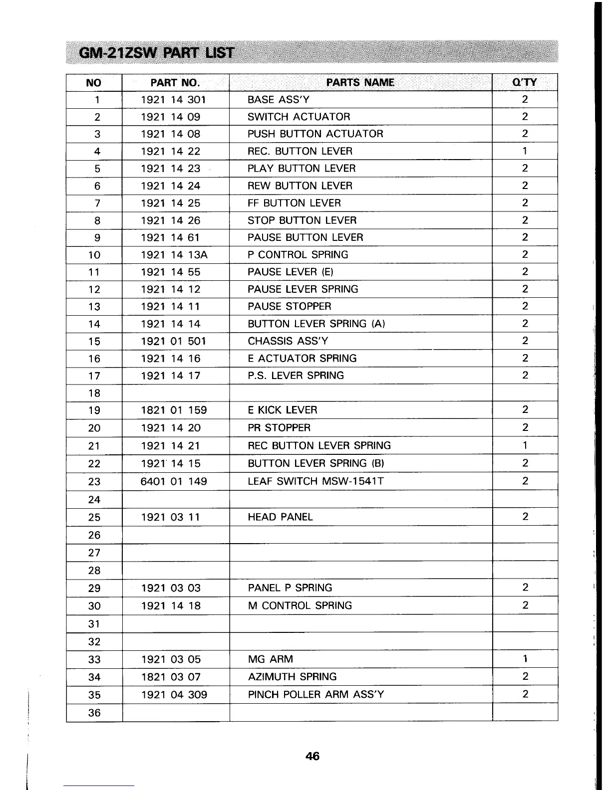 Daewoo AMI-960 - GM-521 ZSW Part List - Mechanical Components; GM-521 ZSW Mechanical Parts Listing (Continued)