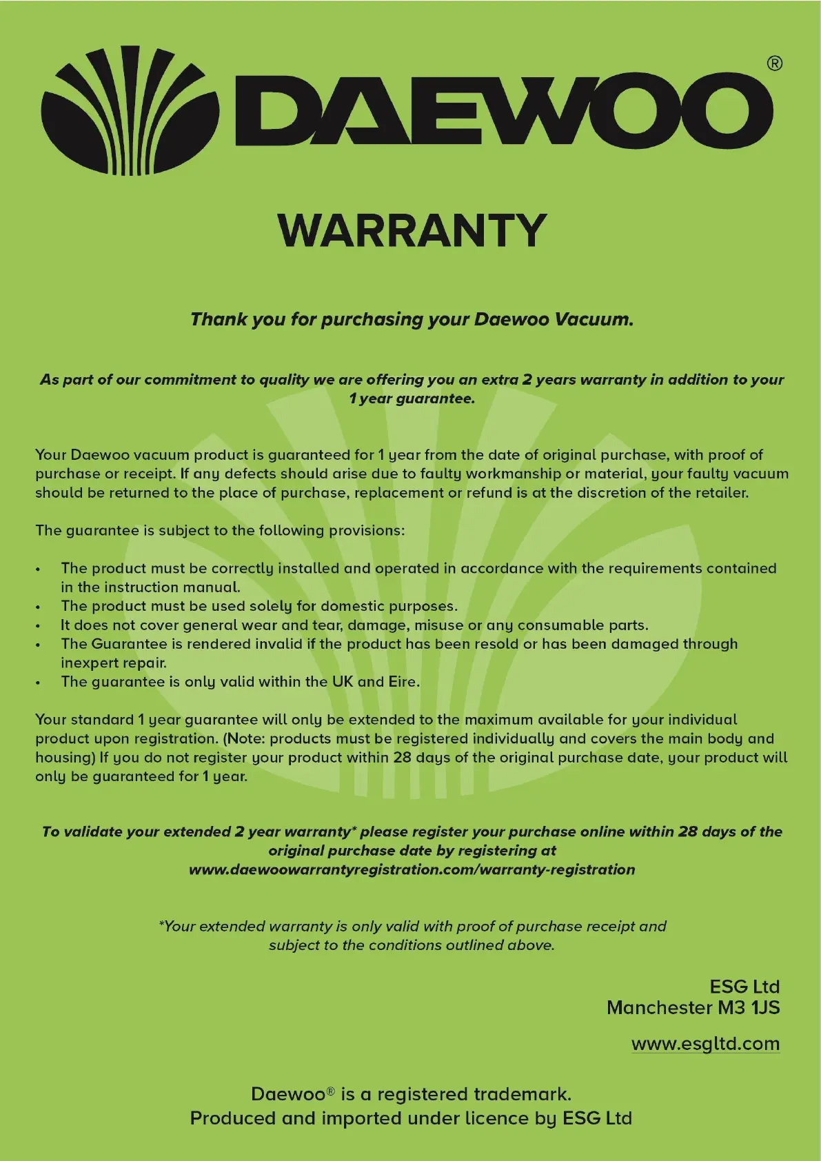Daewoo Cyclone Freedom Pro - Warranty and Guarantee; Standard 1-Year Guarantee; Extended Warranty Registration Process