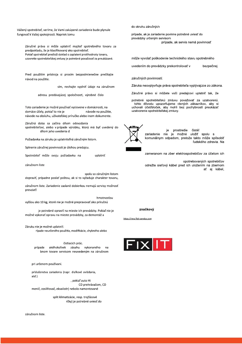 prevádzky, záruka je platná iba v prípade, ak bolo zariadenie