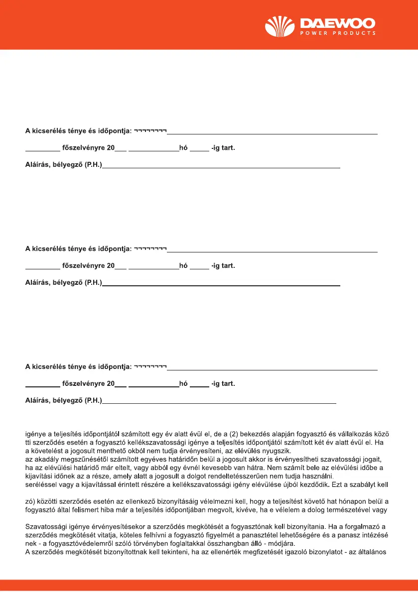 A jótállás határideje a készülékre: 20___ _____________hó _____ nap, és a _____________________________