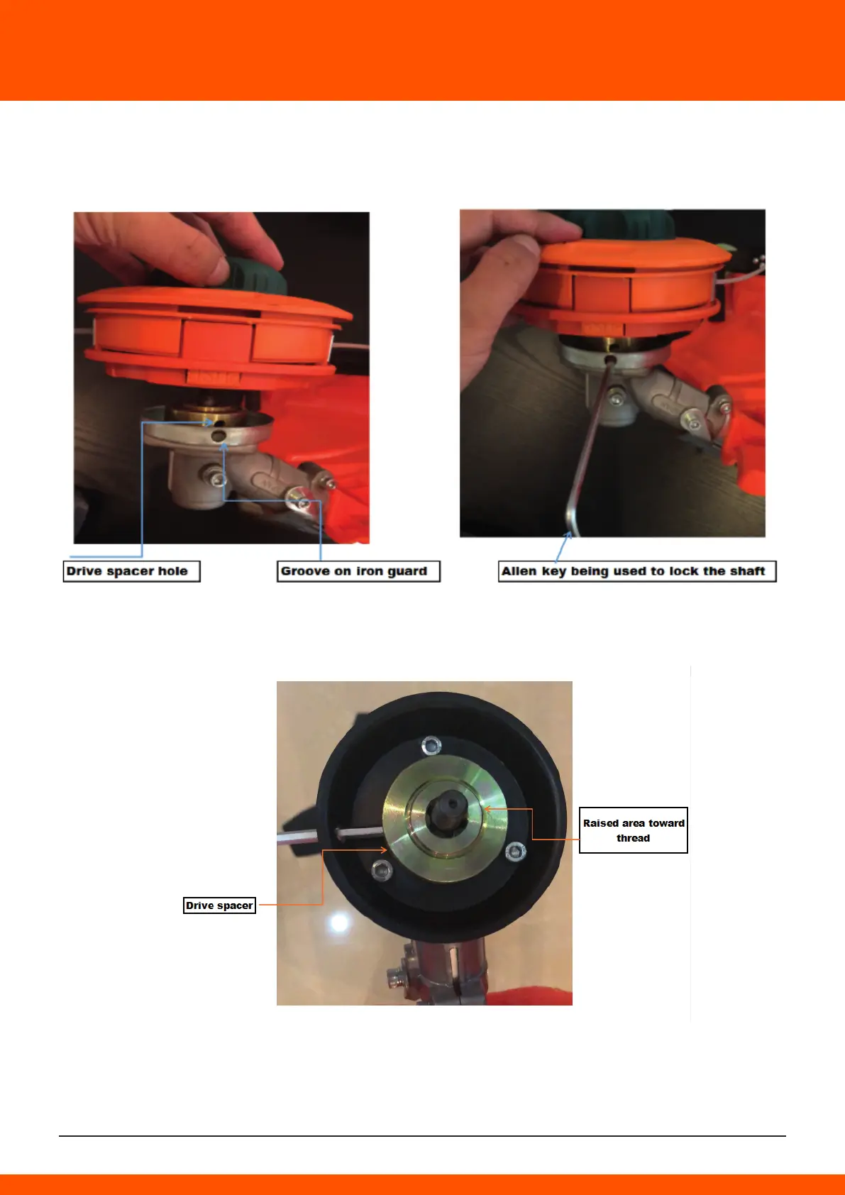 Align hole on drive spacer with groove on the guard, then using the Allen key lock the shaft in