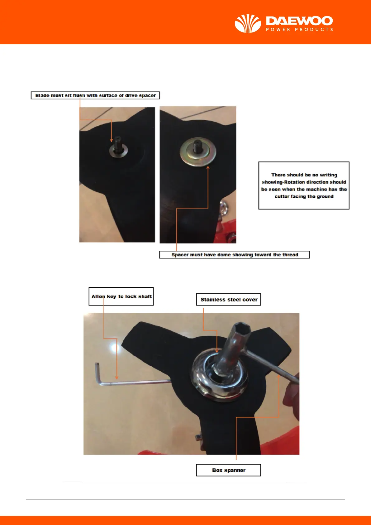 Once blade is in place, put the stainless steel cover over the spacer, put lock-nut onto