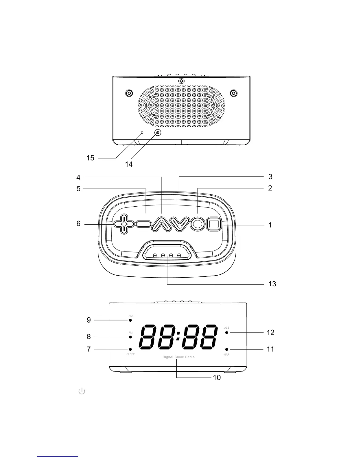 5. VOLUME - / AL2 13. SNOOZE / DIMMER / SLEEP/NAP