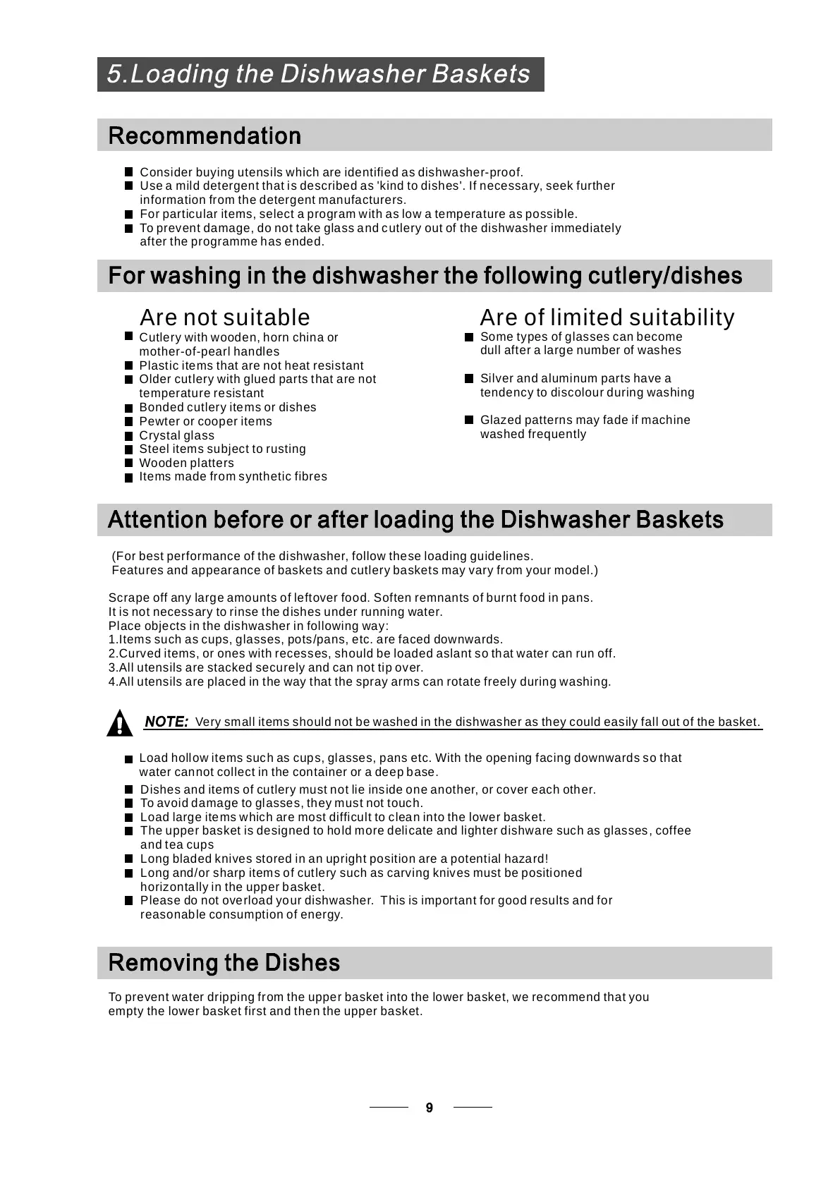 Load h oll ow i tems suc h as cup s, gl asses, p ans etc. With the opening facing downward s so that