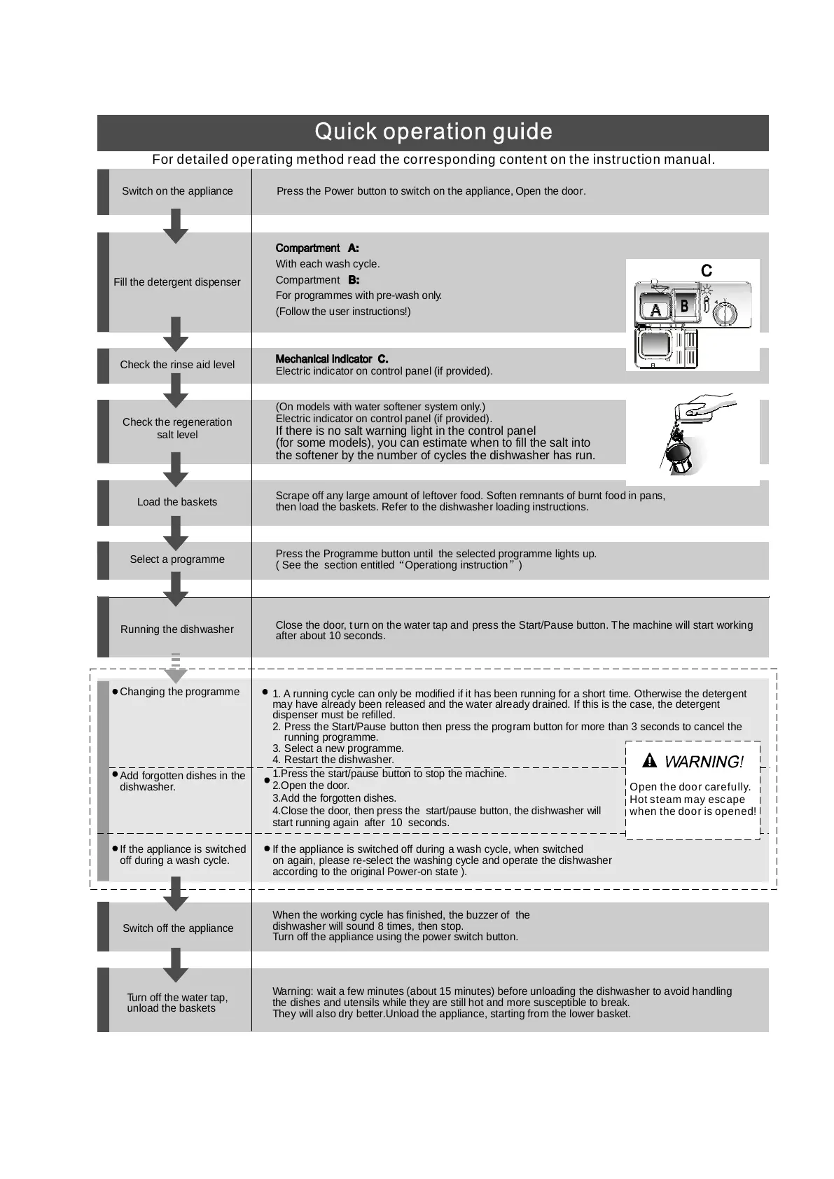 Warning: wait a few minutes (about 15 minutes) before unloading the dishwasher to avoid handling