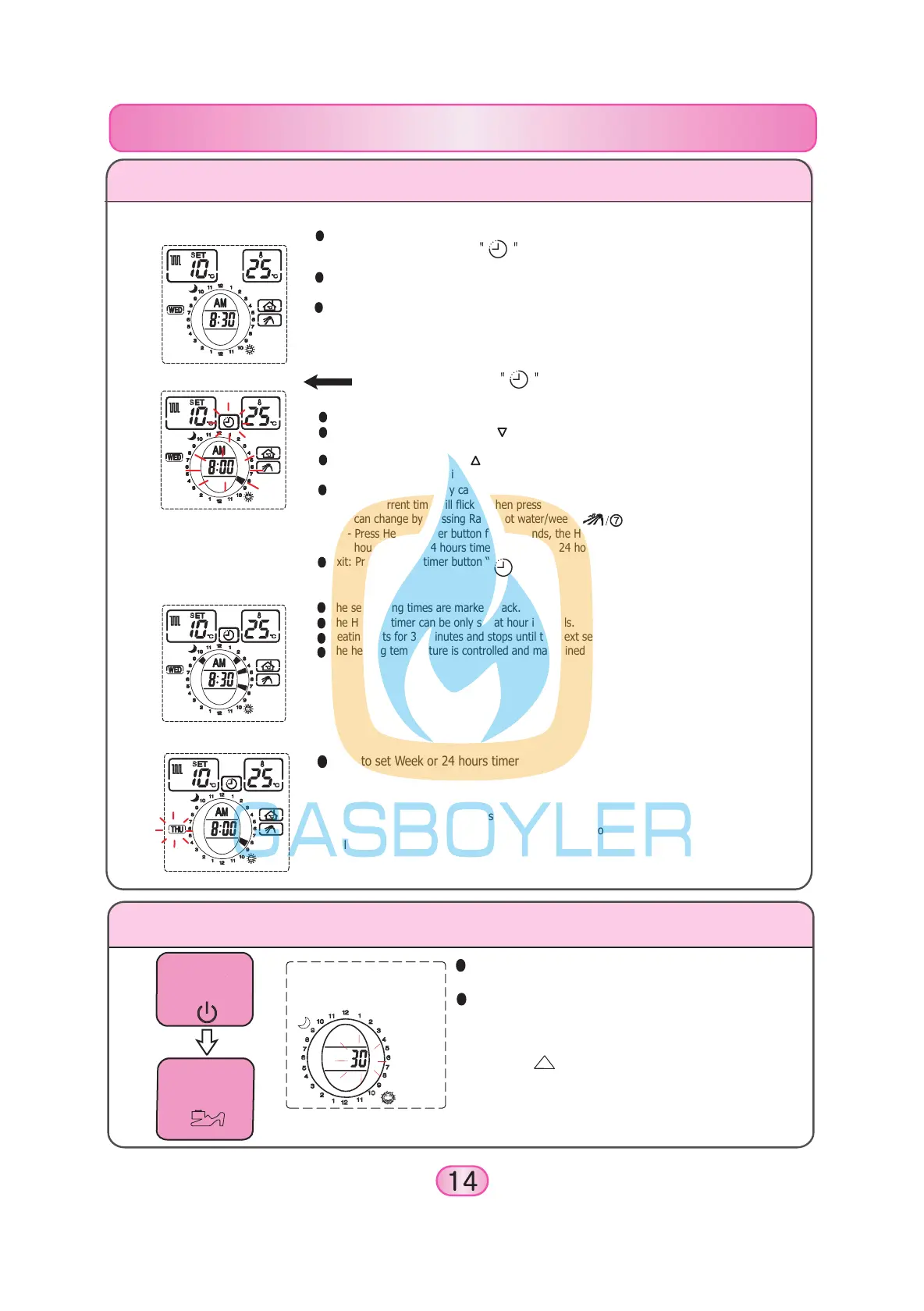 - Press Heating timer button for 3 seconds, the Heating timer will change from week & 24