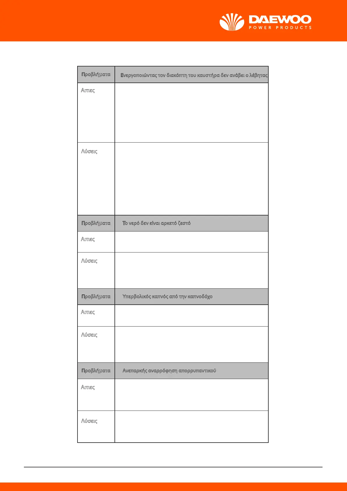- Ανεπαρκή απόδοση του λέβητα.