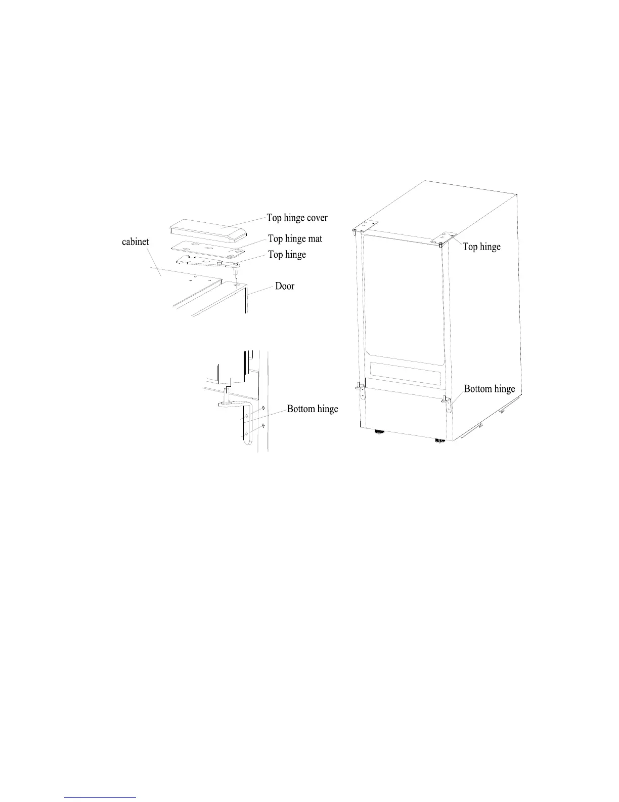 5. Align the door on the bottom hinge and replace the top hinge and top hinge mat.