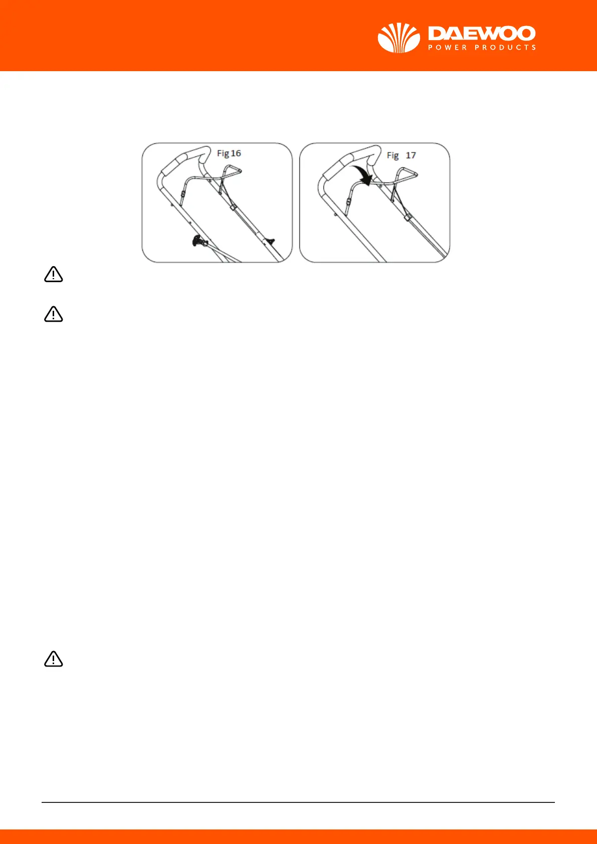 15. Do not tilt the lawnmower when starting the engine or switching on the motor, exceptif the lawn-