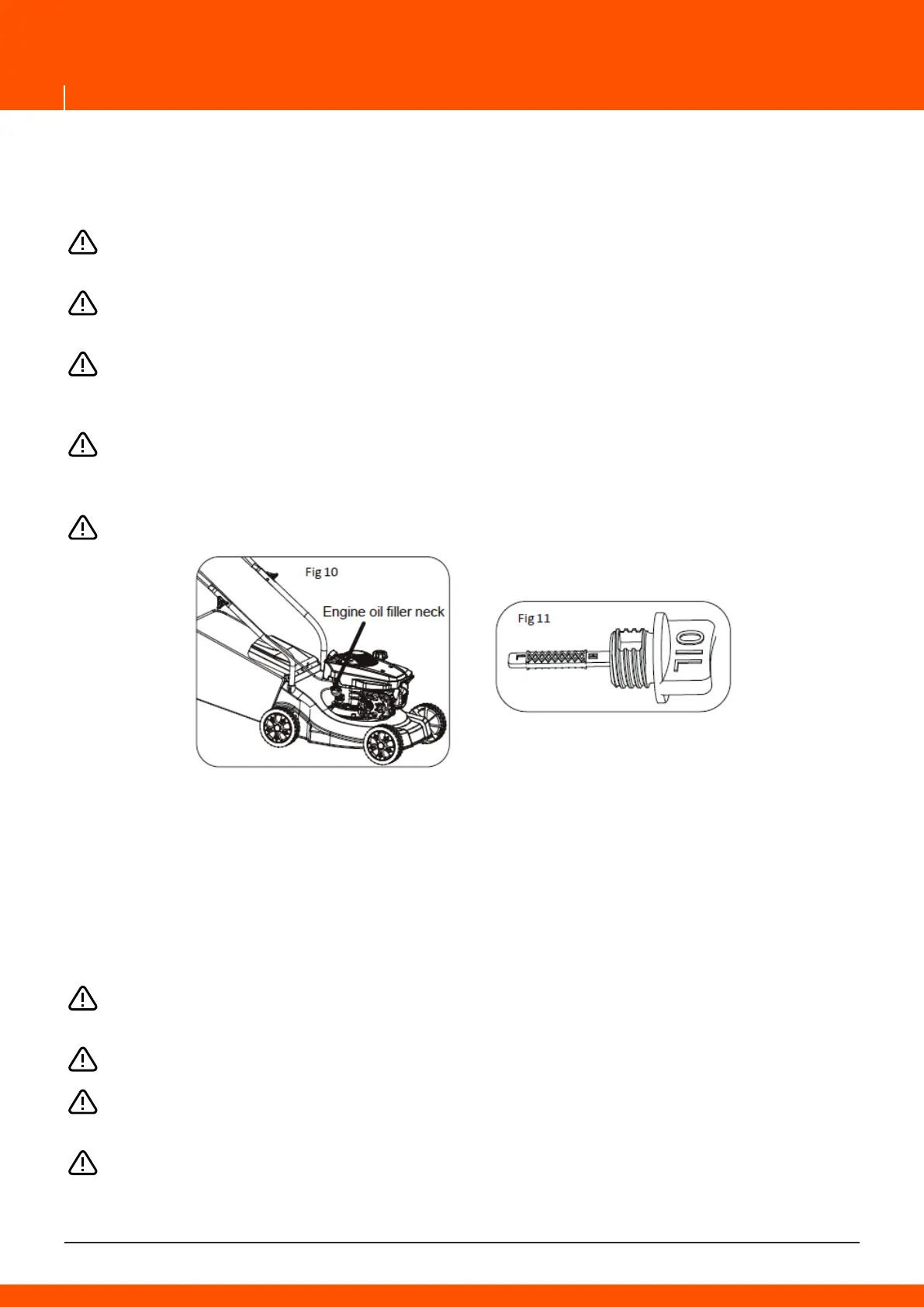 15. Do not tilt the lawnmower when starting the engine or switching on the motor, exceptif the lawn-