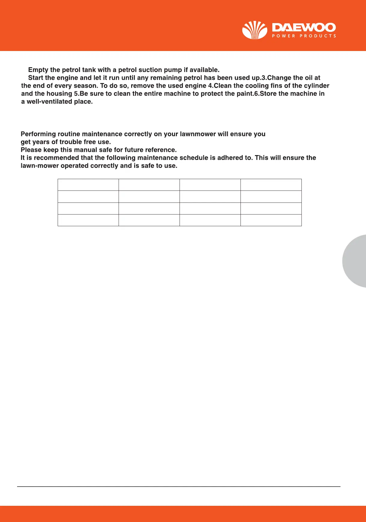 Always let the engine run until it has used up the remainder of petrol in the tank. Empty the engine
