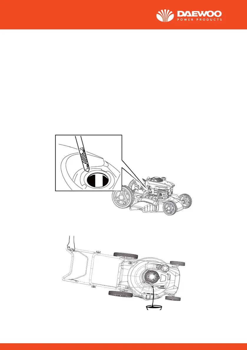 3. Nakloňte sekačku na bok měrkou dolů a vypusťte použitý olej přes