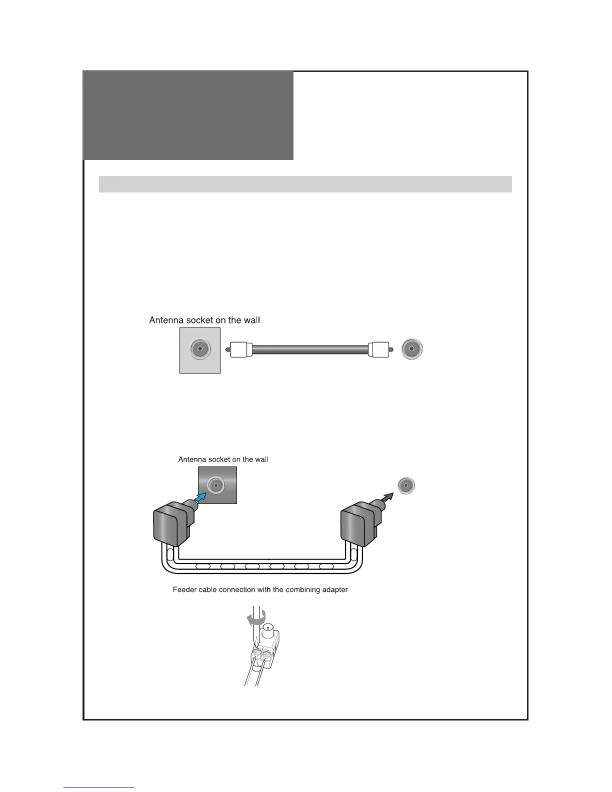 When a feeder cable is used : Plug the coaxial cable to the antenna socket, and fix it firmly by turning it to