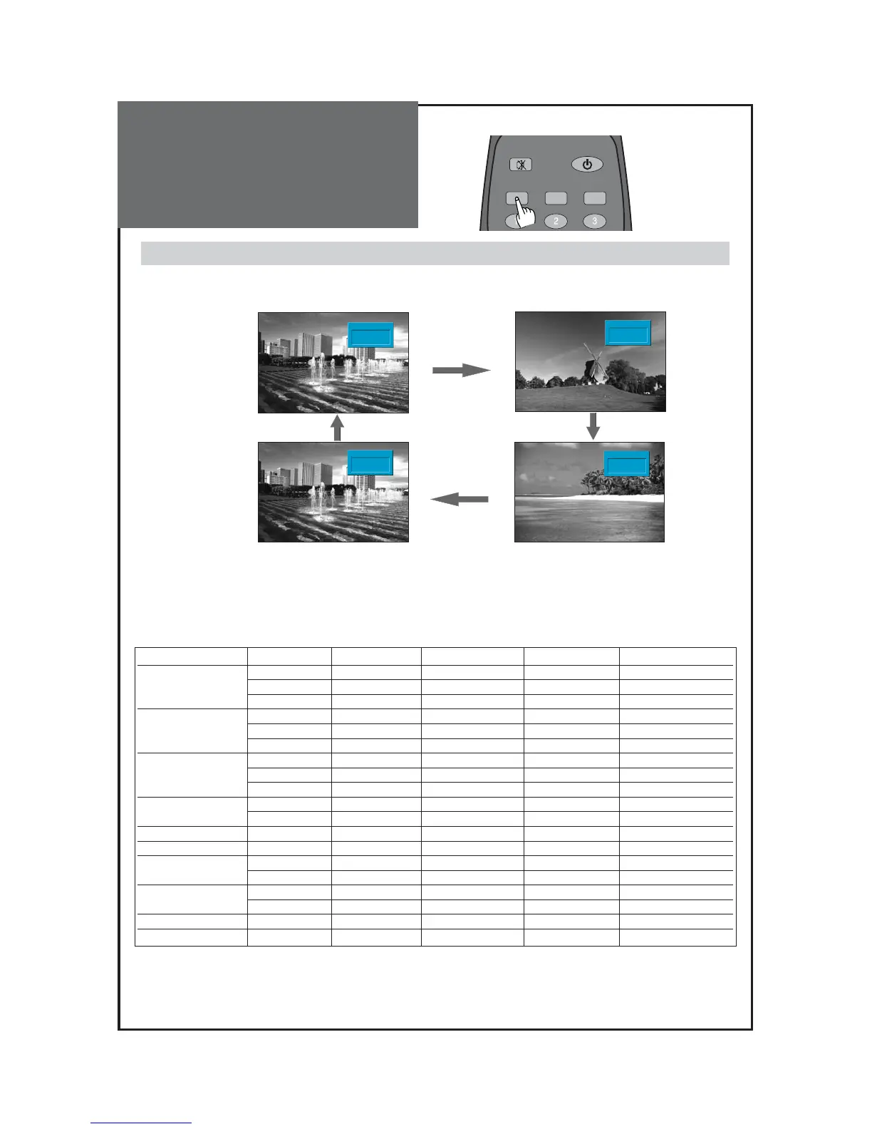 • The screen changes as follows : COMP => PC => HDMI1 => HDMI2 => COMP