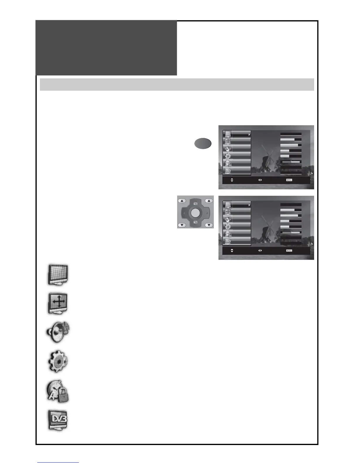 - There are 6 items Picture, Screen, Sound, Install, Function and DVB in the basic menu.