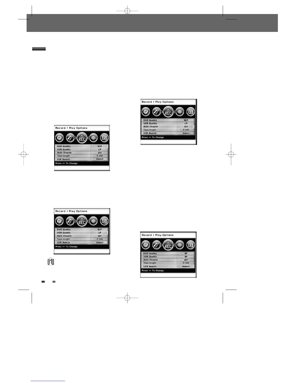 HQ/SP/EP/SEP in DVD mode and SP/LP in VCR mode.