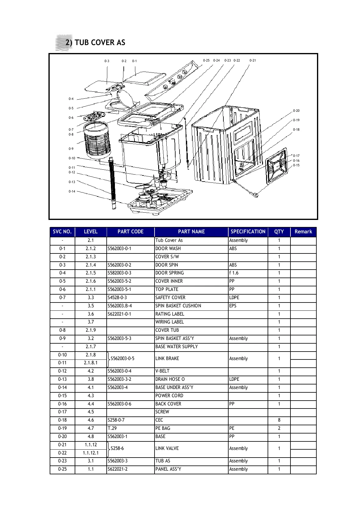 SVC NO. LEVEL PART CODE PART NAME SPECIFICATION QTY Remark