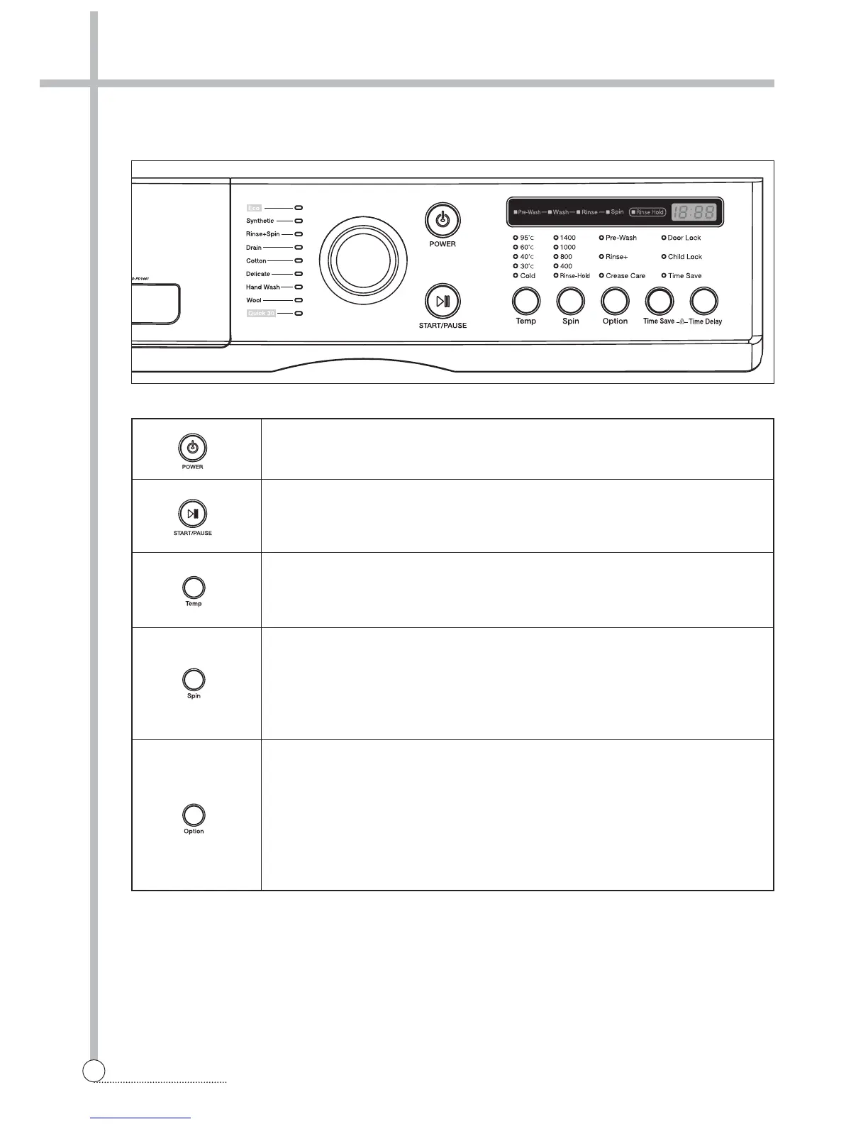 Rinse Hold This function leaves clothes in the machine suspended in the water