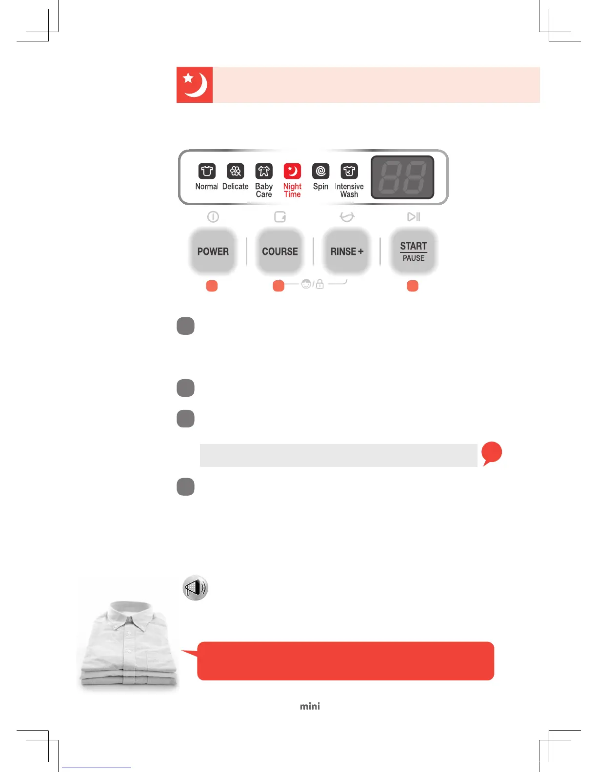 Select the Night time Course to wash your laundry silently at night or when your baby