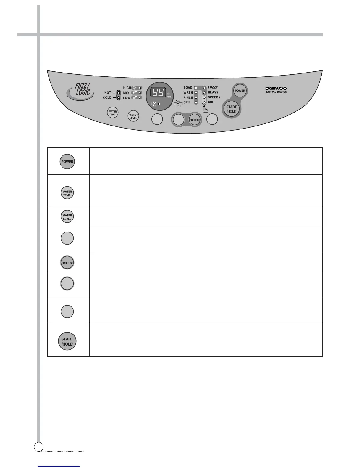 • As the button is pressed, water level is selected by MID → HIGH → LOW