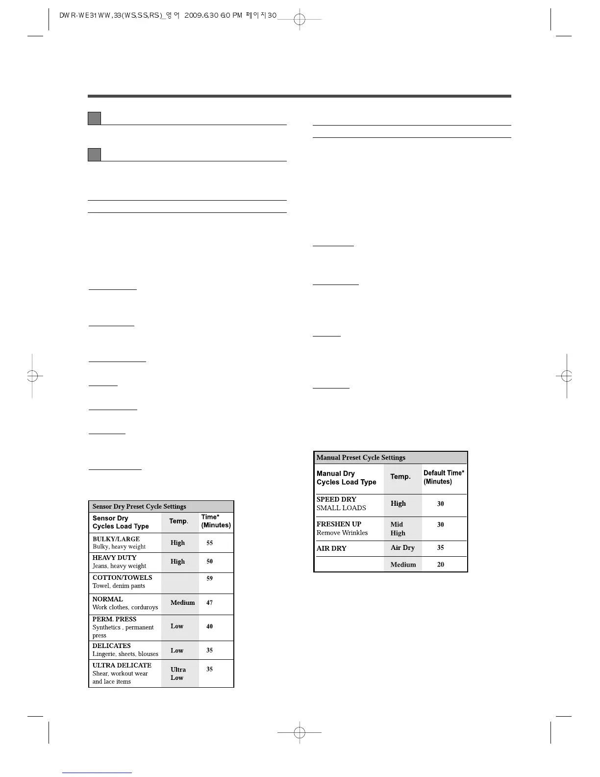 load you are drying. Each cycle dries certain fabrics at