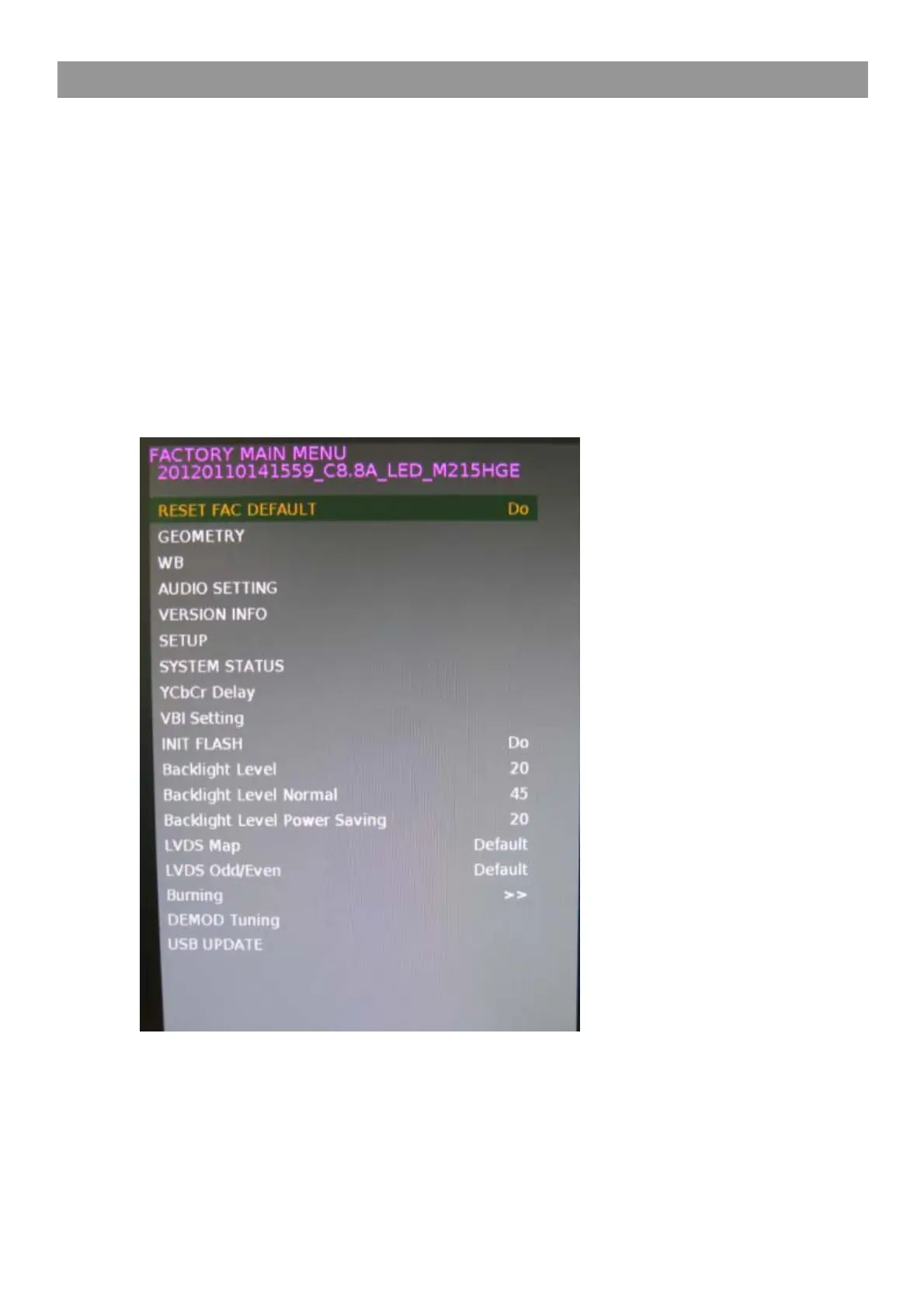 Press “ ◄ / ► ” button enter factory OSD Sub menu and adjust values in the menu.