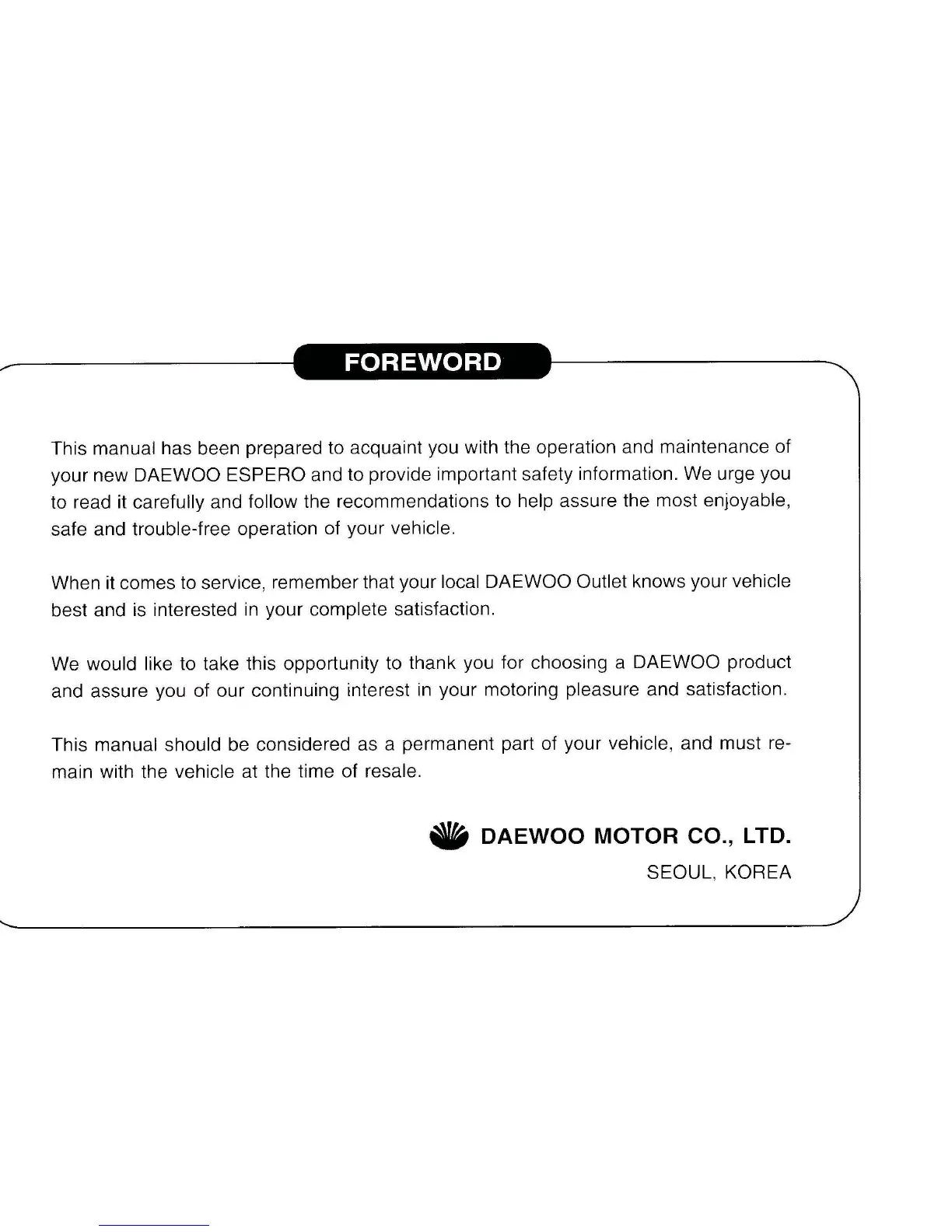 your new DAEWOO ESPERO and to provide important safety information. We urge you