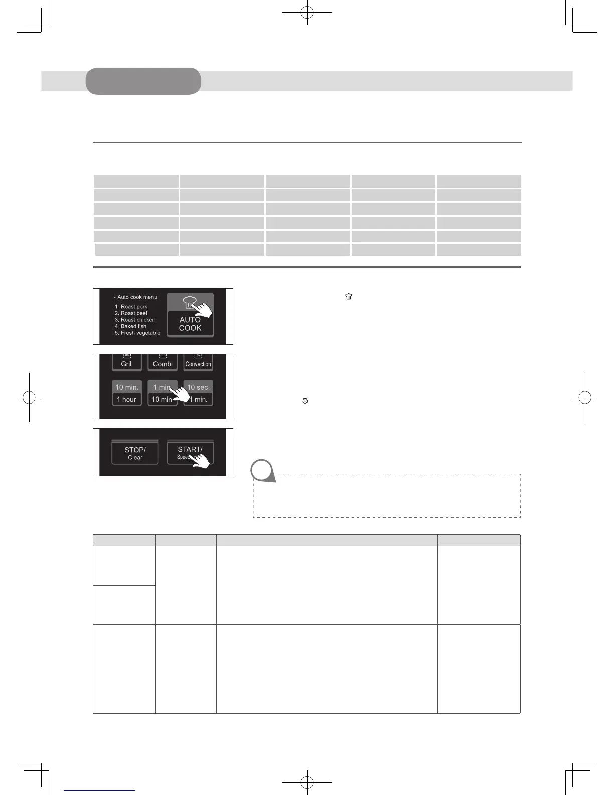 Refer to the auto cook menu chart below for further details.